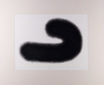 Gravura na cor preta apresentada no modo horizontal. Sob um fundo de cor branca há uma figura de forma orgânica, espessa e alongada de coloração preta, seu contorno é uma borda difusa e irregular com aparência de cerdas que se projetam para fora da forma orgânica. A figura ocupa a parte central do suporte e as duas extremidades apontam para a esquerda. Obs.: P.A.