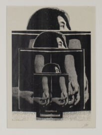 Gravura em preto e branco no modo vertical, há três formas quadradas pretas em tamanhos variados do menor para o maior com a imagem de mãos cruzadas, sobrepostas a essas formas há a figura da parte superior perfil de Yoko . Observações: tiragem de 1/5