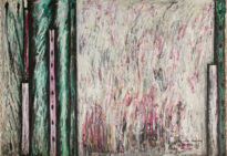 Pintura abstrata em cores no modo horizontal, no lado direito possui maior concentração de pinceladas na direção vertical, cores predominantes turquesa, roxo e preto. No lado esquerdo e centro, as cores predominantes são branco, rosa turquesa e preto