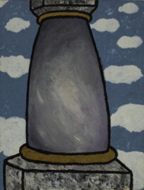 Pintura em cores no modo vertical. Fundo de cor azul que remete a um céu com nuvens, no centro há uma figura semelhante a um baluarte nas cores cinza e dourado