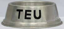 Recipiente metálico na forma de comedouro animal na cor prata, há "TEU" na cor preta