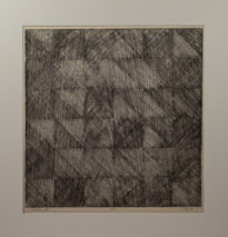 Gravura em preto e branco no modo horizontal. Possui formas geométricas apontadas para baixo e para sim, no sentindo de linhas horizontais