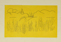 Gravura apresentada na horizontal. No primeiro plano possui uma plantação de trigo. No centro tem-se uma fígura humana caminhando em uma estrada com a ilustração do sol à frente. Há montanhas no fundo e árvores no lado esquerdo. OBS.: Assinatura no lado inferior direito "T.". No verso da obra possui as segujintes inscrições: no lado superior esquerdo: "MEP-99/01.3/005.1-BC" ; "Trigo-Artes Visuais Gravura" ; "Tarsila do Amaral" ; "Calcografia" ; "25,7 x 39". Na parte inferior esquerdo: "546 C.4125/8 106.774.5".