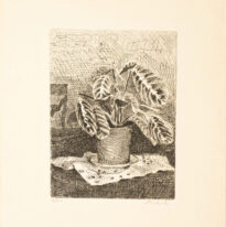 Gravura apresentada na vertical. Em primeiro plano possui um vaso com uma planta, sobreposta a um prato sobre um pano de mesa. Obs.: tiragem 15/30 ; No verso MEP-99/01.3/0022-BC ; Artes vIsuais - Gravura, Babinski, Maciej Calcografia, 39 x 26,3 ; direito superior adesivo 105 294-2 ; esquerdo inferior A.2297 ; direito inferior adesivo 506 Inventáriado Jun/90 e Dez/89