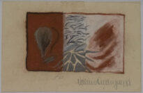 Pintura em cores no modo horizontal, fundo que formam três paisagens. Ao lado esquerdo fundo de cor vermelha com uma figura similar a uma cabaça, ao centro riscos pretos, e ao lado direito manchas na cor vermelha. No verso possui escrito "OYÁ"