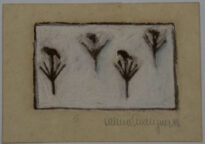 Pintura em cores no modo horizontal. Fundo em cores claras e com quatro figuras de ramos. No verso possui escrito "OSSÃE"
