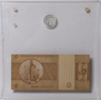 Suporte de acrílico com uma gravurasna cor salmão dentro que remetem a notas de dinheiro, há as escritas "BANCO CENTRAL DO BRASIL", "ZERO CRUZEIRO" e imagem de uma figura humana com os braços encostados nas costas. Observação: A nota superior foi furtada em 2012, deixando resquicios da sua localização