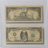 Suporte de acrílico com duas gravuras em preto e branco dentro que remetem a notas de dinheiro, há as escritas "THE UNITED STATES OF AMERICA", "ZERO DOLLAR" e figuras do Tio Sam e casa branca